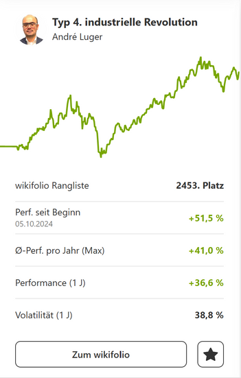 Mein Top-wikifolio Distressed Value landet momentan auf Platz 57. Danach folgen die wikifolios Next Mobility auf Rang 808, das wikifolio Selector auf Rang 2.129, das wikifolio 4. Industrielle Revolution auf Rang 2.453 und das wikifolio Momentum USA auf Rang 4.238.